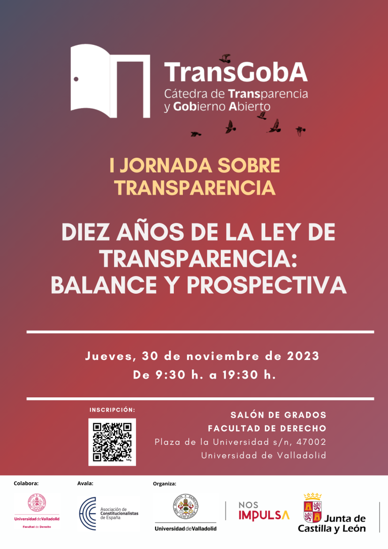 El 30 de noviembre tendrá lugar la I Jornada sobre Transparencia: ‘Diez años de la Ley de Transparencia: balance y prospectiva’, dirigida por Mª Aranzazu Moretón Toquero, directora de TransGobA y coordinada por Joaquín Meseguer Yebra, experto del Foro de Gobierno Abierto de España. Miembro de la Cátedra TransGobA. En la jornada participarán expertos en derecho y administración pública. Las inscripciones pueden realizarse en esta página web, donde también se puede consultar el programa completo. La Jornada se realizará en el Salón de Grados de la Facultad de Derecho, desde las 9:30 hasta las 19:30 horas.