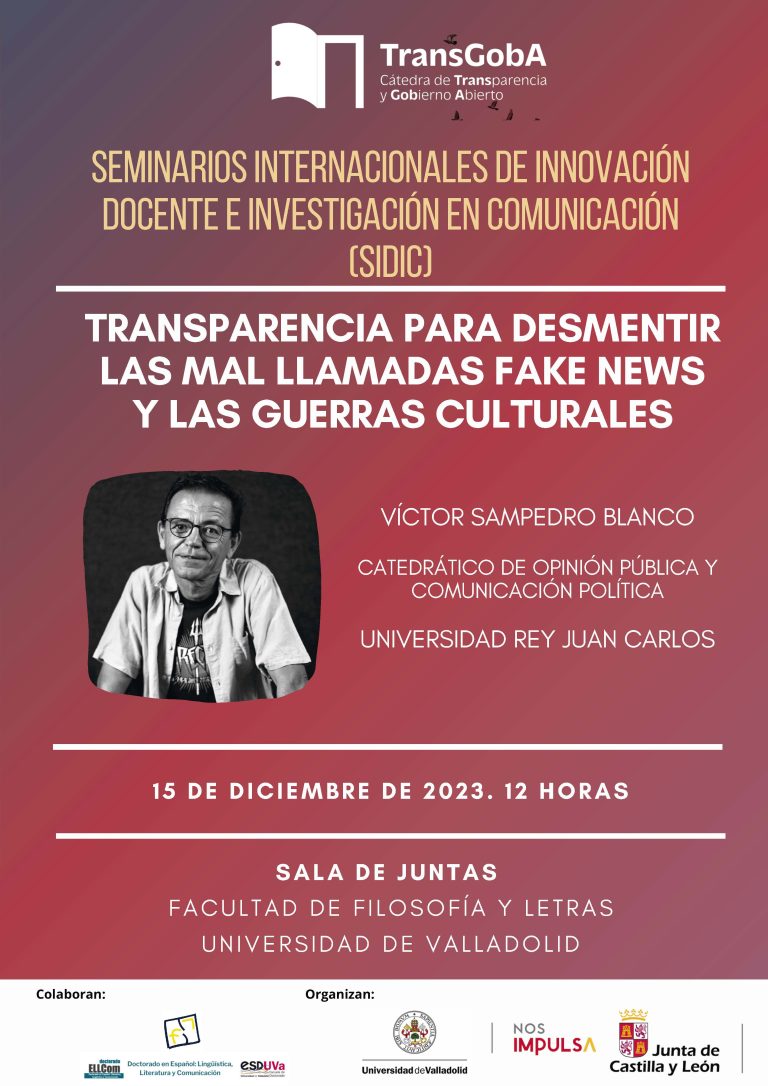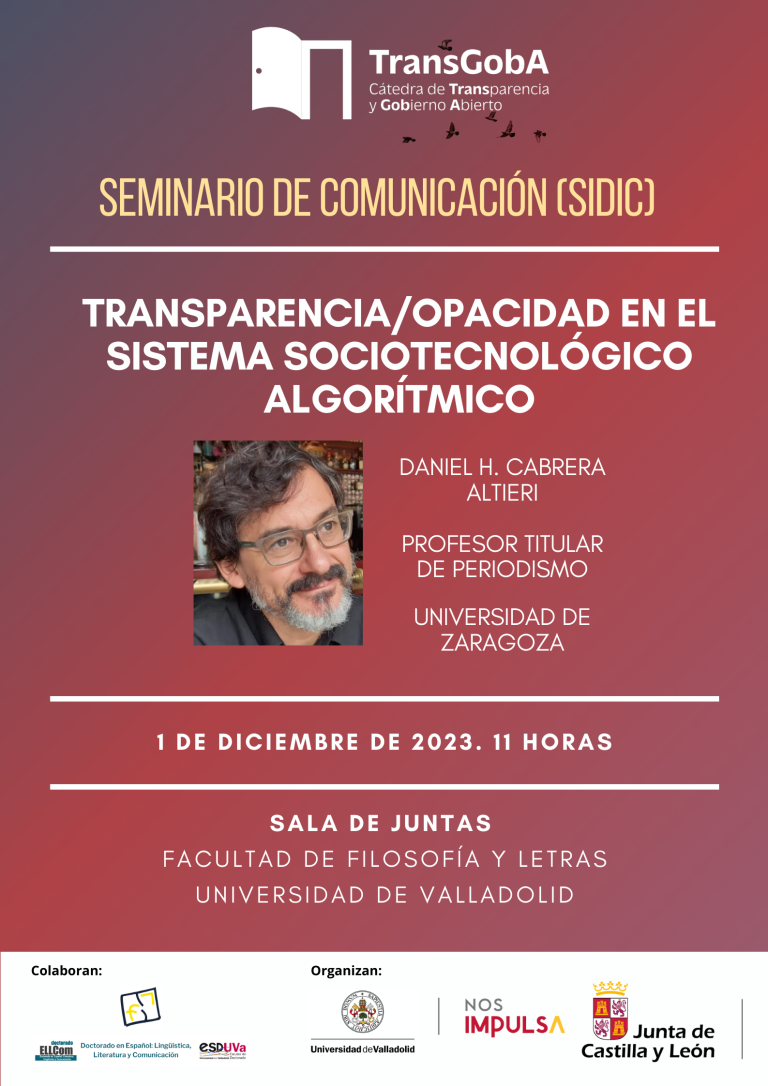 La Cátedra también ha organizado dos seminarios dirigidos especialmente a personas que investiguen en Comunicación. El primero de ellos, será el Seminario de Investigación en Comunicación ‘Transparencia/opacidad en el sistema sociotecnológico algorítmico’, impartido por Daniel H. Cabrera Altieri, Profesor Titular de Periodismo de la Universidad de Zaragoza. Se celebrará el 1 de diciembre a las 11 horas en la Sala de Juntas de la Facultad de Filosofía y Letras. Este espacio acogerá también el segundo seminario, titulado ‘Transparencia para desmentir las mal llamadas fake news y las guerras culturales’, en el que participará Víctor Sampedro Blanco, Catedrático de Opinión Pública y Comunicación Política en la Universidad Rey Juan Carlos de Madrid. Este tendrá lugar el 15 de diciembre de 2023 a las 12 horas.